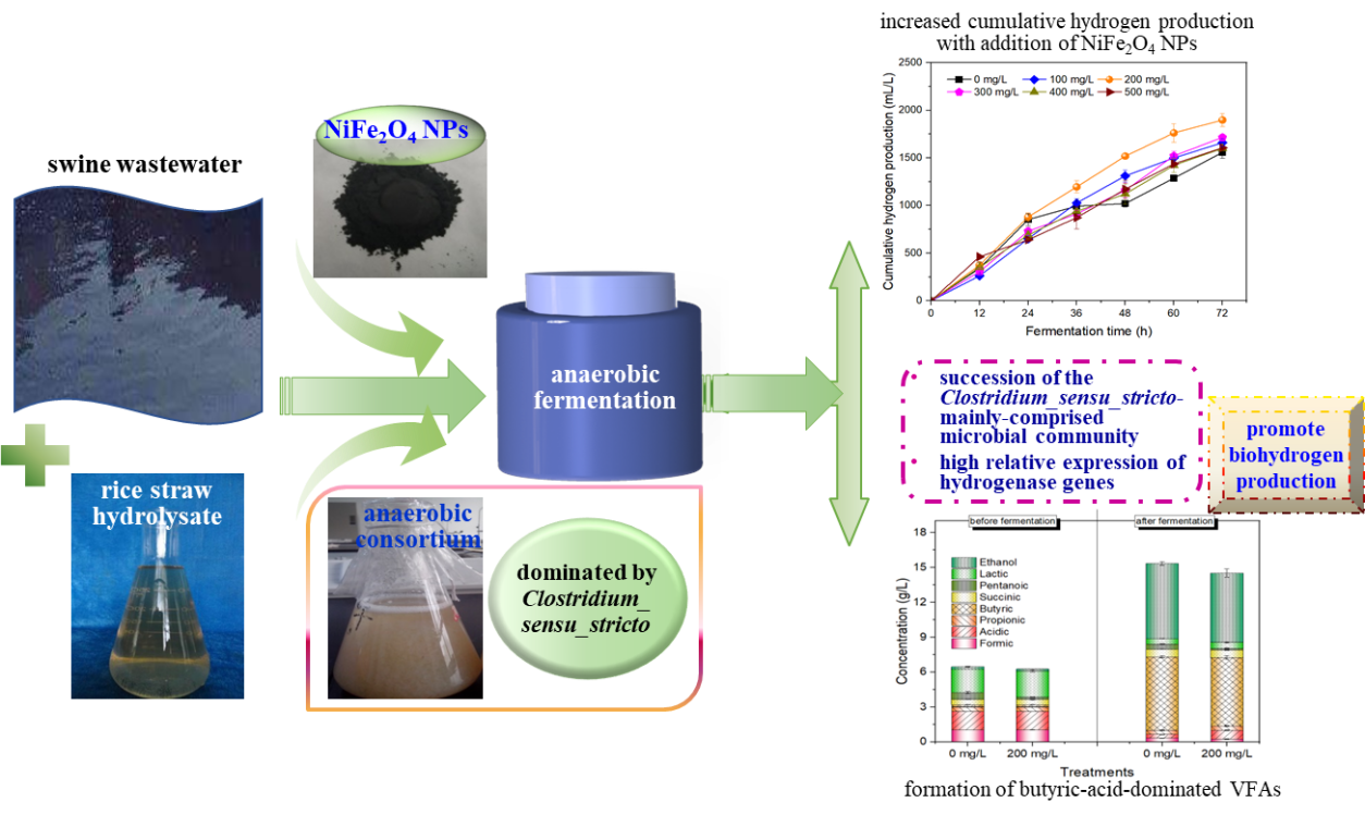 近年来,废水生物制氢已成为循环经济和废水利用的可持续途径,纳米粒子添加已成为提高废水制氢效率的重要手段。传统的以活性污泥为接种物的废水发酵制氢模式可能产生较大比例甲烷气体,难以获得高纯度氢气。近日,本课题组通过绿色合成铁酸镍纳米粒子和厌氧菌群的耦合作用,实现猪粪废水的高值转化和生物氢合成。相关成果以“Increasing biohydrogen production from swine wastewater influenced by anaerobic consortium and nickel ferrite nanoparticles”为题发表在《Fuel》(中科院一区,TOP期刊)上,生食品学院张琴教授为通讯作者。本研究发现,将一种新型厌氧菌群应用于猪粪废水发酵产氢,耦合添加绿色合成的铁酸镍纳米粒子,使累积产氢量提高20%以上,并从菌群组成和氢酶基因表达变化分析了厌氧菌群和铁酸镍纳米粒子耦合促进产氢的机制。