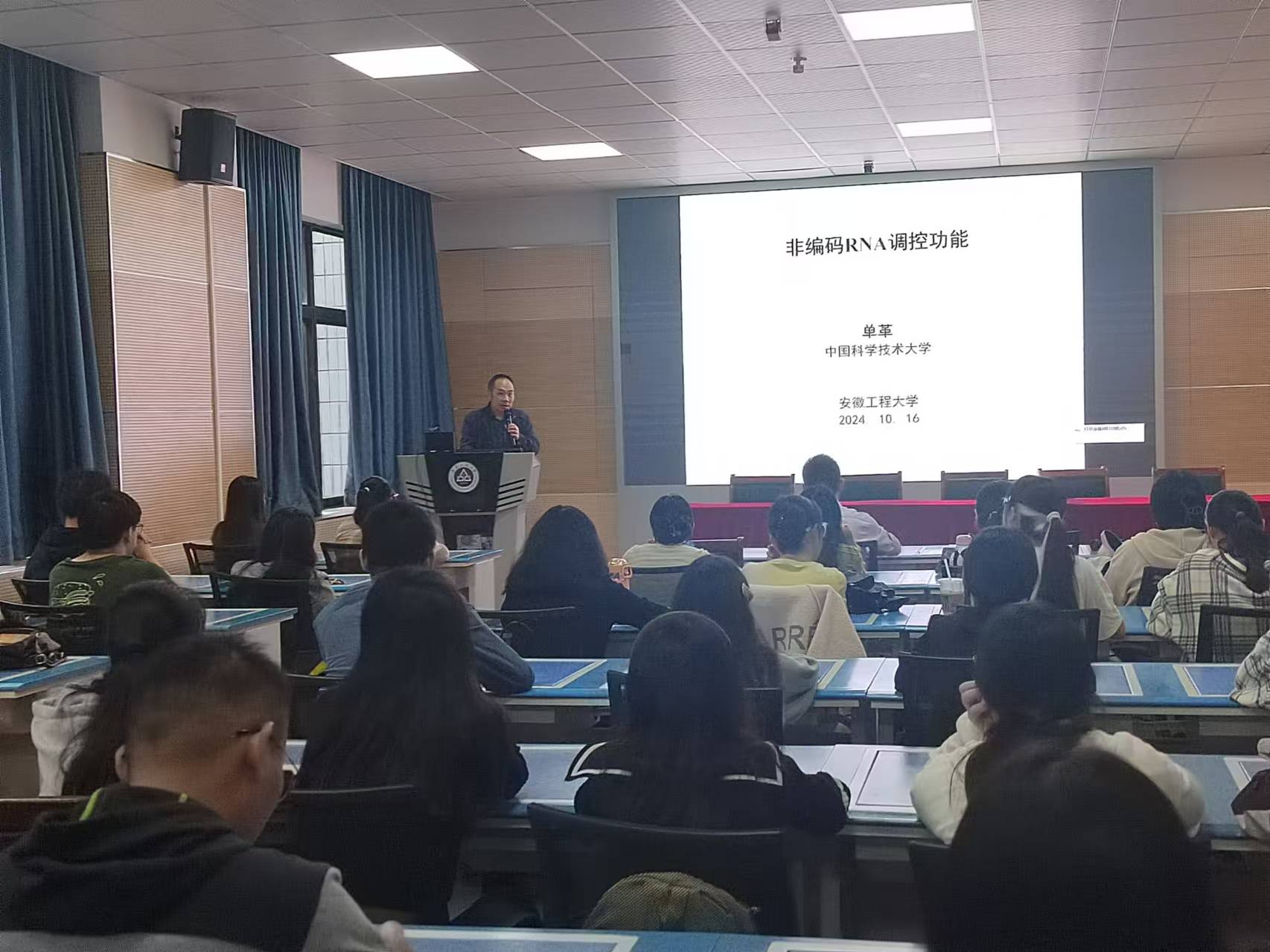 10月16日,中国科学技术大学单革教授应邀来生物与食品工程学院为师生作题为“非编码RNA调控功能”学术报告。学院院长葛飞、部分教师和研究生代表参加报告会,报告会由葛飞主持。