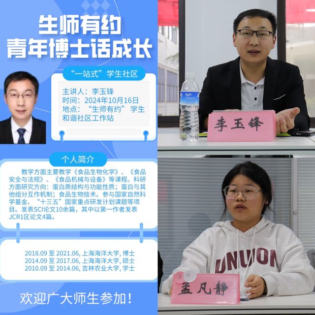 为帮助新生顺利适应大学生活,全力助力其成长与发展,并充分发挥“一站式”学生社区在引领和服务学生方面的作用,10月16日,生物与食品工程学院在学院团委青年之家举行第五期青年博士话成长活动。本次活动由青年博士李玉锋担任主讲嘉宾,学院党委副书记王彦青、团委负责人何祥玲以及学院各专业20名学生代表参加,活动由何祥玲主持。