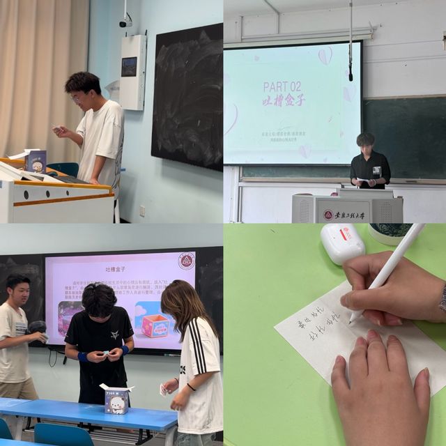 朋辈互助,寄语未来。全院27个班级分别由心理委员组织开展一场“吐槽盒子”趣味心理主题班会。班会中,同学们纷纷写下近期在校生活中所遇到的心理压力和困扰,放入“吐槽盒子”,由心理班委和其他班委一同从朋辈角度进行抽取解答,在增强班级凝聚力的同时,更在轻松的班会氛围中解答了同学们的心中烦恼。5月21日下午,学院学生会心理部组织开展“写给十年后的自己的一封信”活动,共收到百余封来信,笔者们认真写下想对未来的自己所说的话,认真封装,待来日启封,在憧憬未来的同时,更加深了对未来规划的思考。