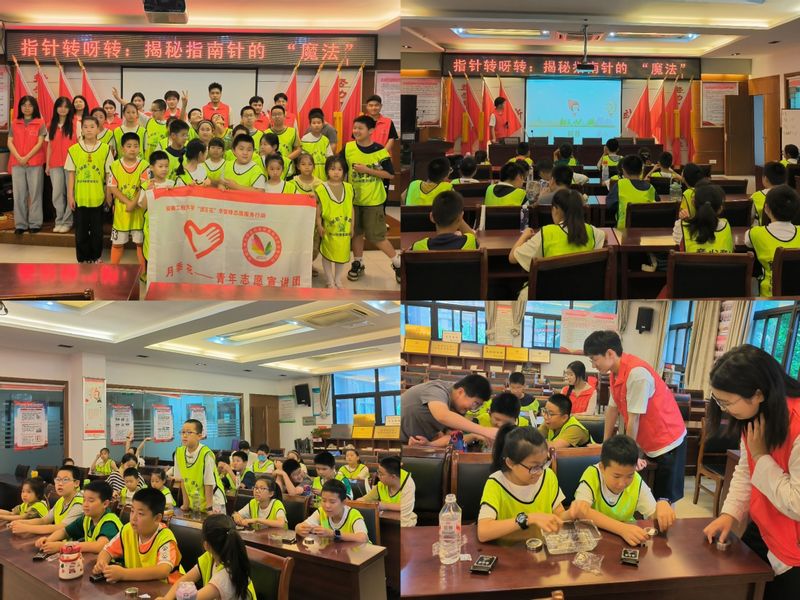 故事引航探奥秘,短片激趣启新知。志愿者以“小红帽探险” 的趣味故事切入,巧妙引出指引方向的工具——指南针。播放精心制作的科普短片,以动态画面展示指南针在古今中外的应用场景,从古代航海到现代地质勘探,让孩子们对这一“魔法工具”有了初步认知。古今原理融讲解,问答游戏贯科学。在知识宣讲环节,志愿者结合视频内容,深入浅出地讲解指南针的工作原理、历史起源及实际应用。为增强互动性,现场给每个孩子准备了指南针进行实际应用。巧手制器观磁妙,水浮磁针验指南。志愿者分组指导孩子们动手操作,通过“磁针磁化、固定浮水、观察指向”等步骤,让孩子们亲眼见证磁现象的神奇。当看到自制的磁针在水面稳定指向南北时,孩子们纷纷发出惊叹,在实践中加深了对科学原理的理解。